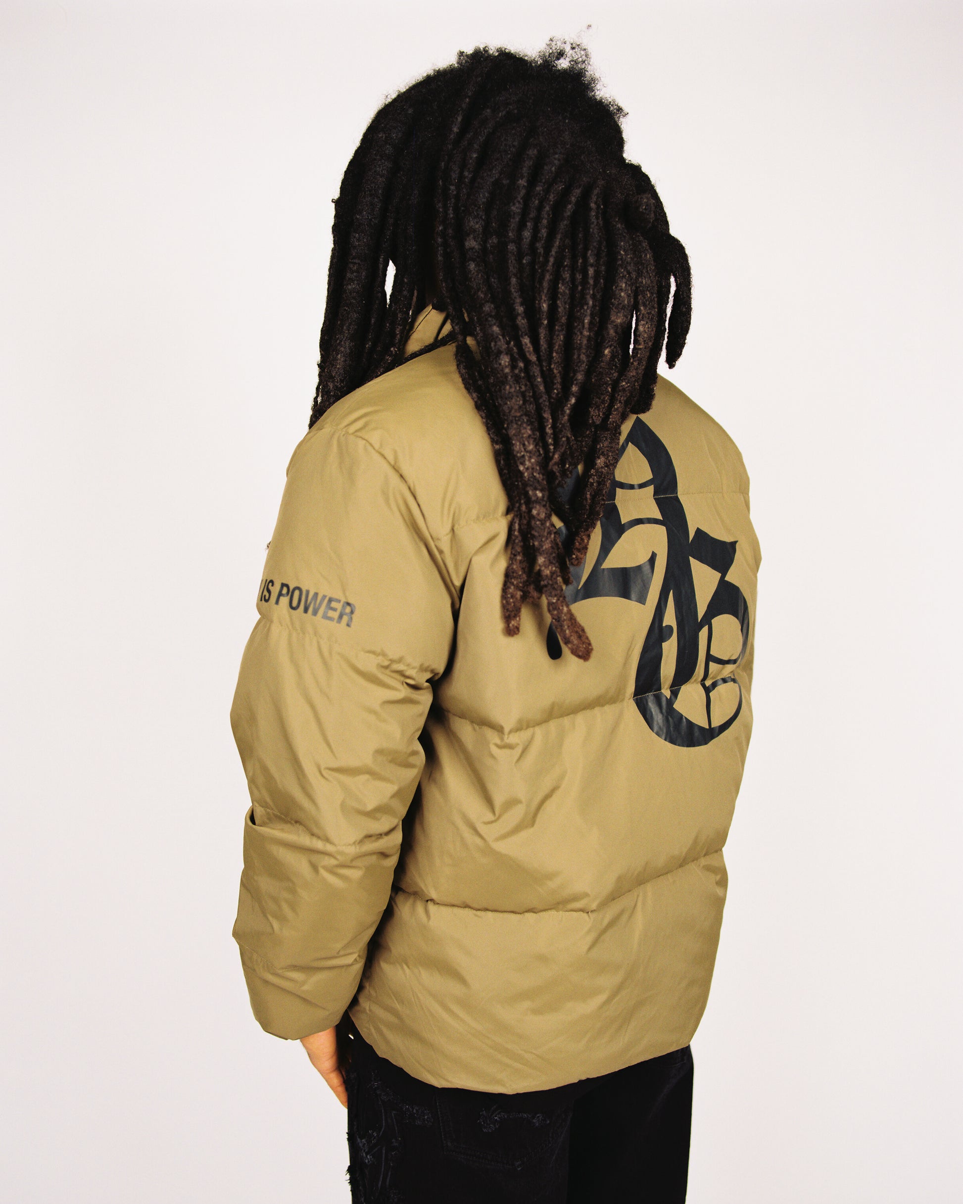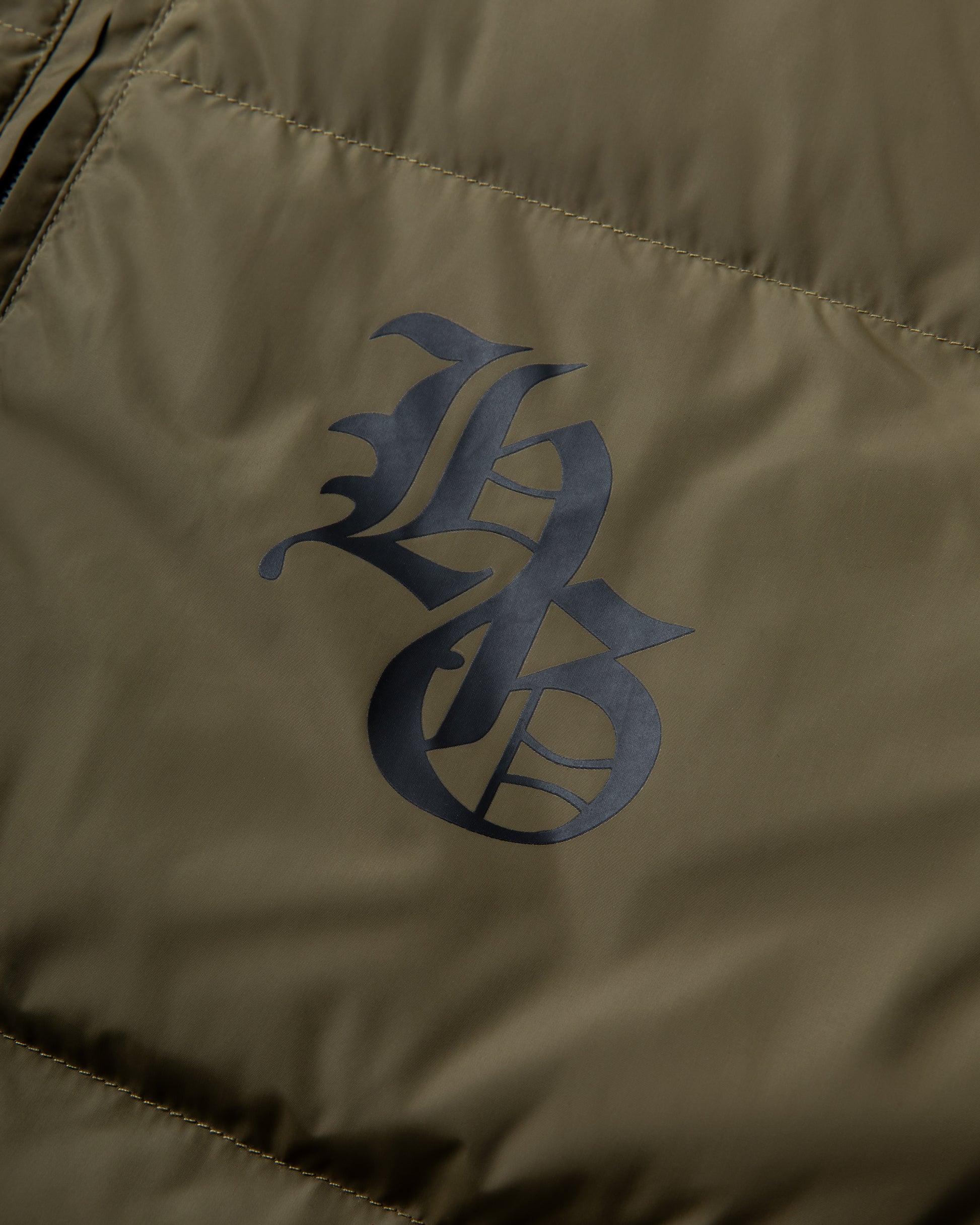A structured insulated puffer featuring bold Holy Ghost crest artwork across the back and chest. Designed as a statement winter layer within Archive 01.